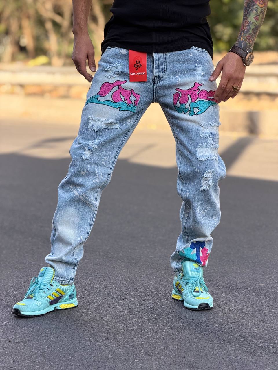 شلوار لی مامفیت آبی روشن زاپدار و گلدوزی شلوارلی مردانه زاپدار